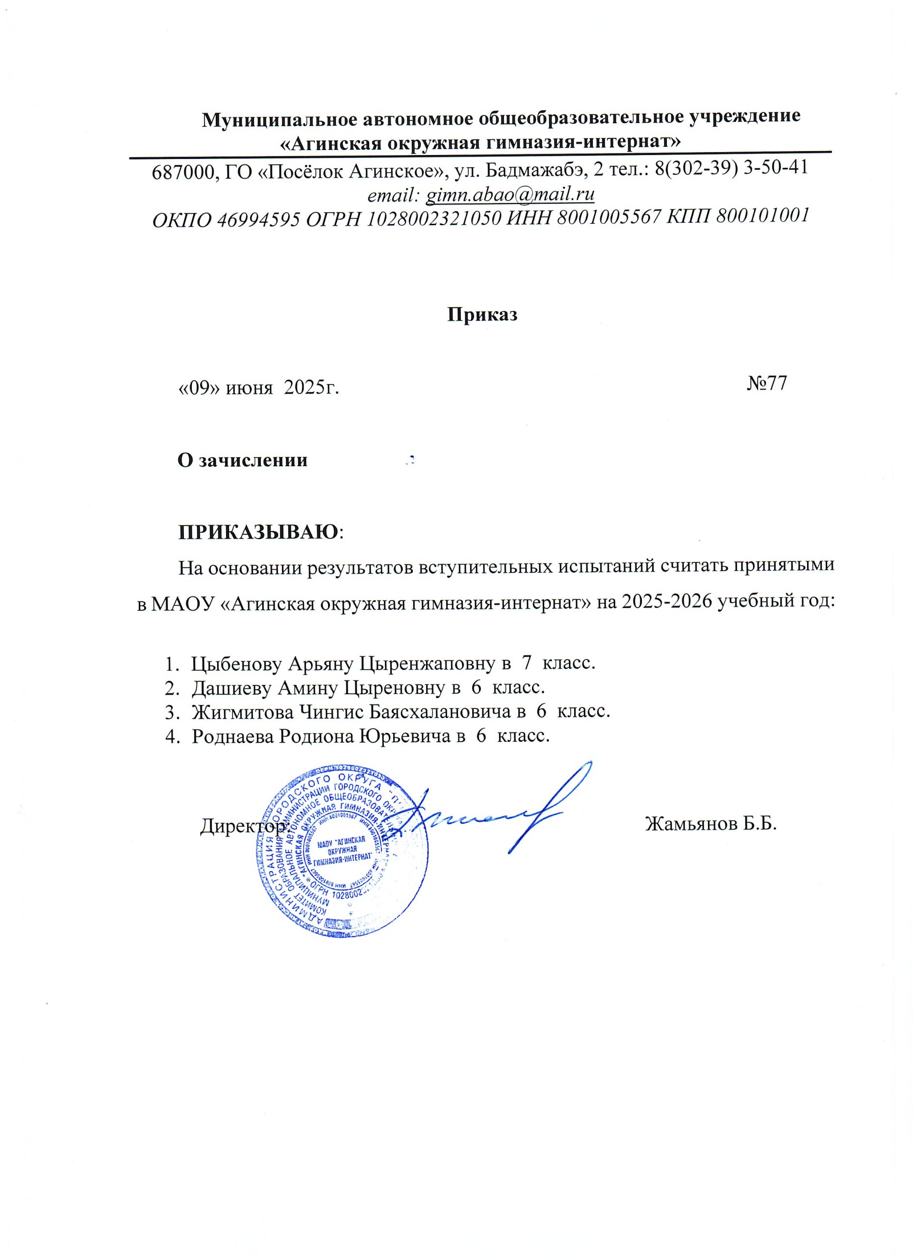 Приказ от 09.06.2025 о зачислении в 6,7 классы